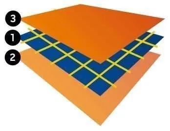 Složení materiálu: PES tkanina typu RIPSTOP (1) s vnitřním nánosem polyuretanu (2) a teflonovou úpravou (3) proti smáčení vodou. Materiál je odolný proti oděru, stárnutí a UV záření. Minimální pevnost v tahu 1100/900 N (vzorek 20 × 5cm).