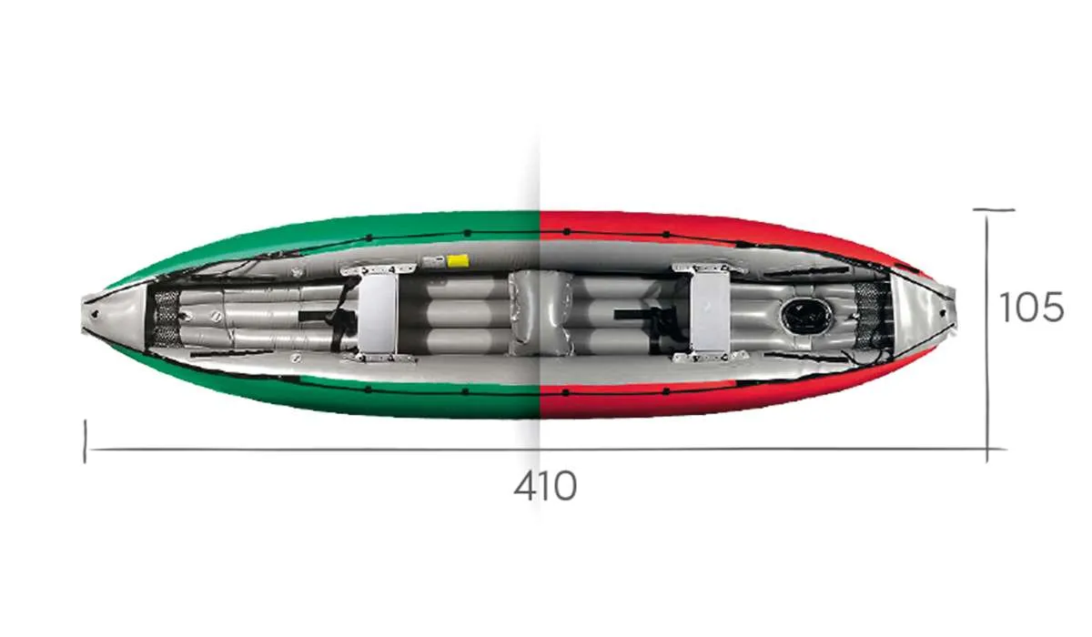 2. b) Šířka kánoe (o 10 cm větší než u kánoe Scout) a také šířka nafukovacího dna, které zasahuje pod polovinu tloušťky bočních válců a tím značně zvyšuje vztlak.