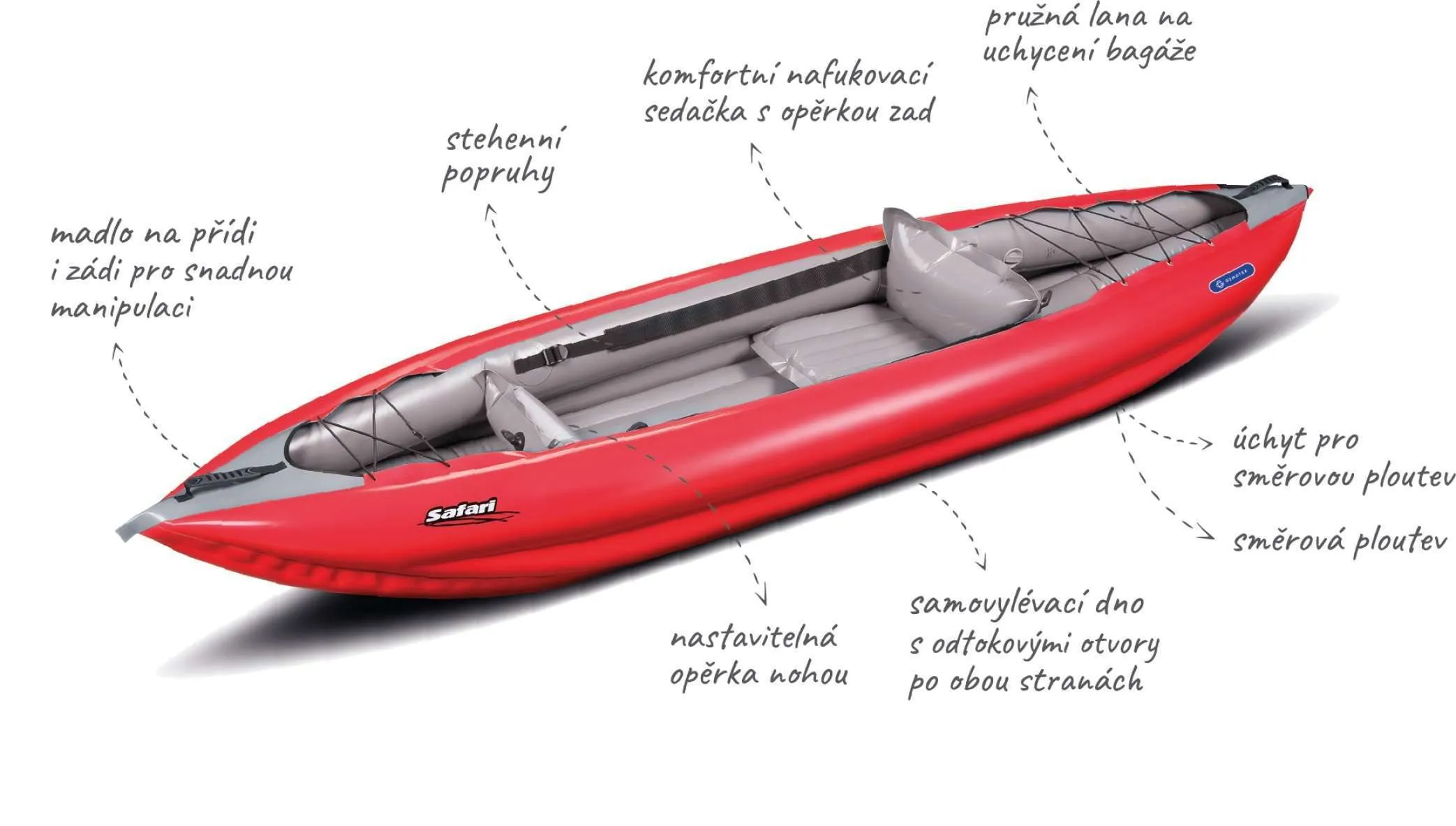 Možnost nastavit tlak a tím i výšku sedáku, aniž byste museli opustit pozici sedu v lodi, je jedinečná! Během pádlování můžete upravit stabilitu Safari podle obtížnosti vodního toku.