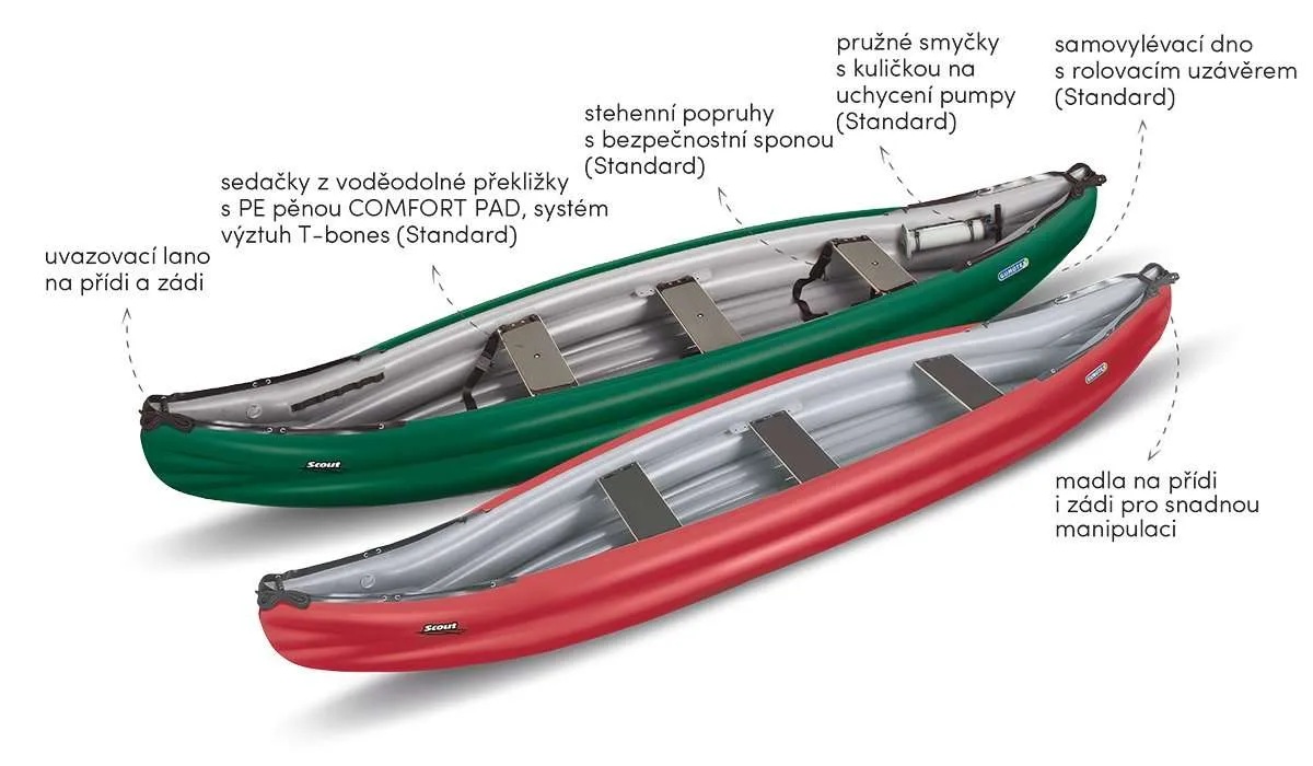 SCOUT je nafukovací kánoe s novodobou konstrukcí. Hlavními přednostmi jsou komfortní výbava, obrovský vnitřní prostor, vysoká nosnost, vyvážené jízdní vlastnosti. To vše ocení dobrodruzi s bagáží, lovci adrenalinu v peřejích i rodiny s dětmi. U tohoto typu lodi rozlišujeme verzi Standard.