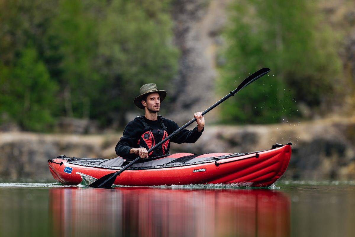 Obrázek vpravo: Užší trup ve tvaru V a zaoblené boční válce kajaku (SEASHINE) umožňují pádlerovi náklon proti vlně, kterým zabrání převrácení kajaku.