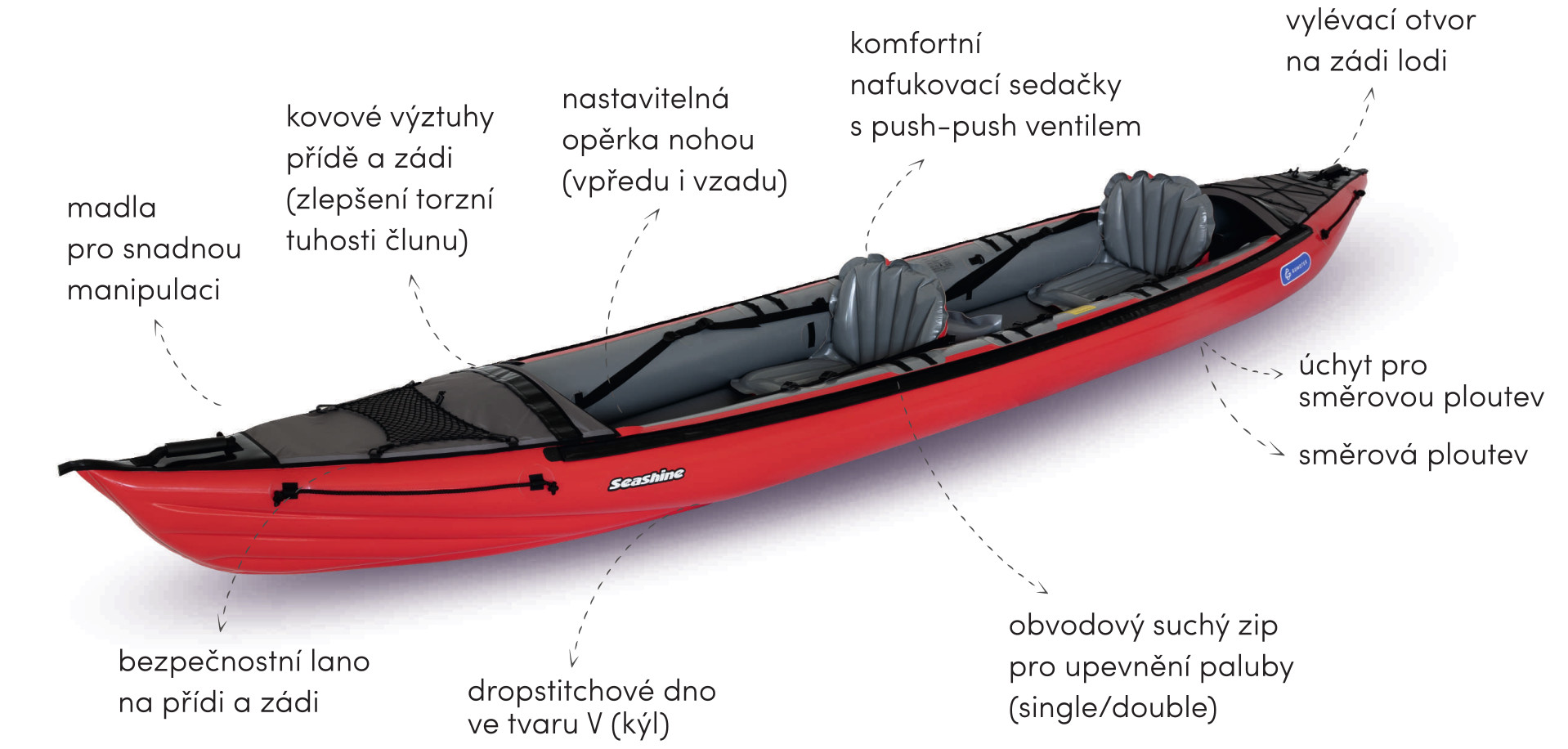 Velký vnitřní prostor SEASHINE je navržen pro sportovní jízdu z hlediska rychlosti a skluzu, A ZÁROVEŇ nabízí využitelnost pro 1 až 3 vodáky.