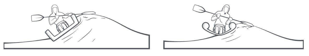 Obrázek vlevo: Ploché dno kajaku se svislými boky (zde „celodropstitch“ se širokým dnem) má tendenci se na vlně „přilepit“ a převrhnout se, jakmile se vlna převalí.