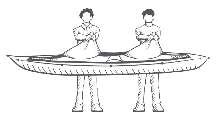 Obrázek vpravo: Užší trup ve tvaru V (prostřední válec dna výrazně vystupuje a formuje kýl) a zaoblené boční válce kajaku (SEAWAVE) umožňují pádlerovi náklon proti vlně, kterým zabrání převrácení kajaku.