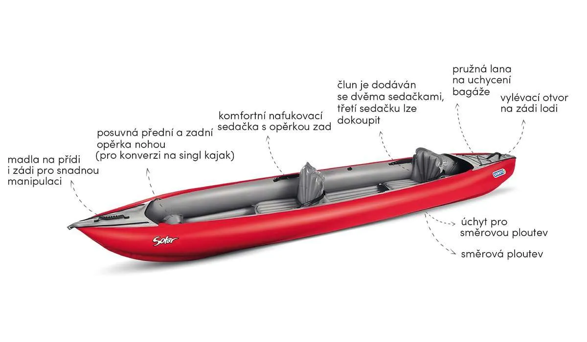 V balení setu je navíc dvojčinná ruční pumpa GTX s objemem 2/4 litru slouží k nafukování všech typů lodí GUMOTEX. Redukce na Push-Push ventil je součástí balení. Dále v setu je navíc 2x dvoudílné teleskopické pádlo na sklolaminátové žerdi. Na pádle lze nastavit libovolný úhel a délku pádla v rozmezí 230-240cm. Přídavná přední paluba (volitelné příslušenství) brání přelití vody přes špici a tím zvyšuje uživatelský komfort při jízdě, např. na moři. Kajak je vybaven vylévacím otvorem v zadní palubě člunu. SOLAR je v základní verzi vybaven dvěma sedačkami a úchyty pro třetí sedačku. Umístění sedaček je variabilní, SOLAR muže být jednomístným, dvoumístným i trojmístným kajakem.
