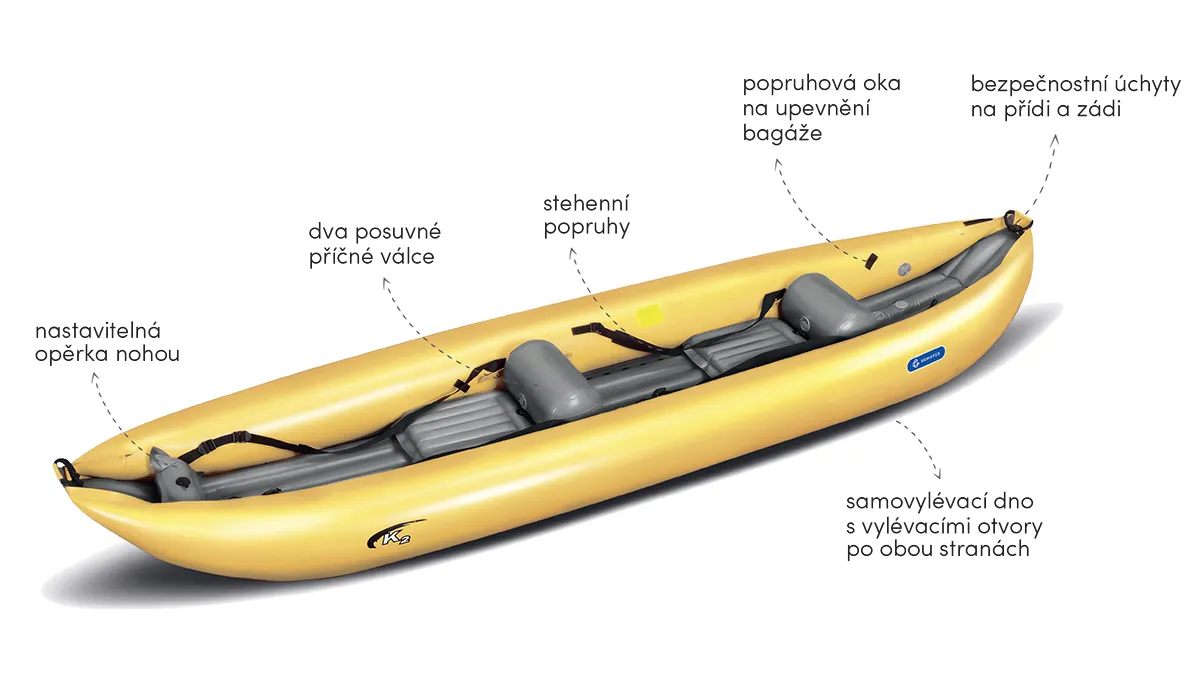 K2 nabízí pohodlné nafukovací sedačky a dostatek prostoru k sezení. Navíc jsou vybaveny stehenními popruhy, jež umožňují lepší ovládání kajaku v peřejích.